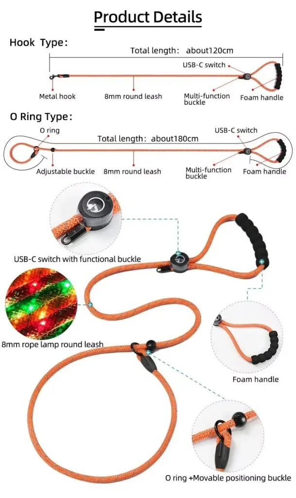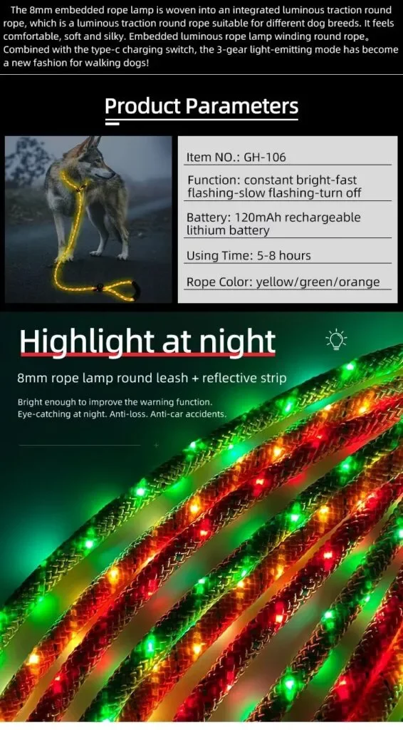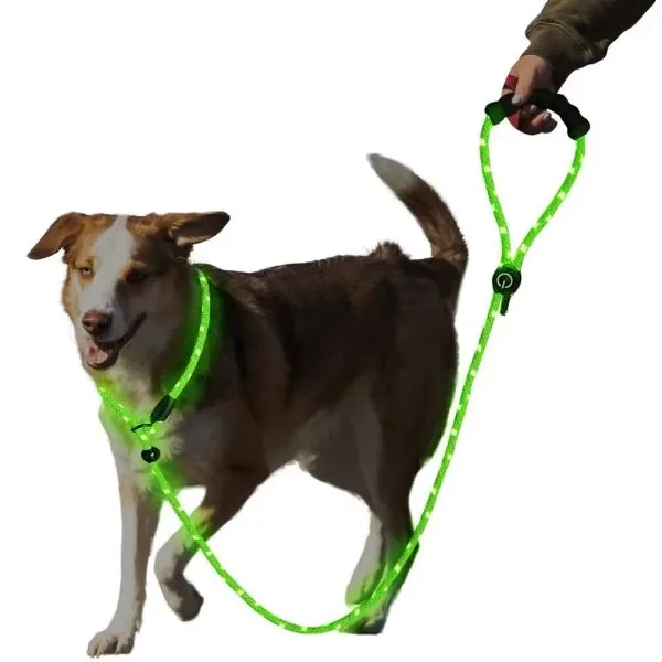 Hot Sale Personalized 0.8CM Embroidered LED Dog Leash Glow in the Dark with Durable Polyester Hook